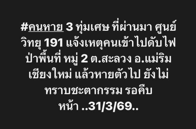 วันที่ 1 เม.ย. 69 มีรายงานจากพื้นที่ ต.สะลวง อ.แม่ริม จ.เชียงใหม่ ตั้งแต่คืนที่ผ่านมาว่า มีชาวบ้านเข้าไปช่วยดับไฟป่า ในพื้นที่ป่าบ้านวะลวง ในหมู่ที่2 ต.สะลวง อ.แม่ริมเมื่อวานนี้ จนกระทั่งช่วงกลางคืนเวลาเที่ยงคืน ซึ่งเสร็จสิ้นภารกิจ ชาวบ้านและเจ้าหน้าที่ได้ลงมาแล้วตรวจนับเช็กยอดจำนวนคน ปรากฏว่าหายไป 1 คน เป็นชายอายุประมาณ 50 ปี จึงวางแผนออกติดตาม จนกระทั่งเช้านี้ได้มีการออกติดตามอีกครั้ง