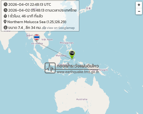 วันที่ 2 เม.ย. 69 สำนักงานสำรวจธรณีวิทยาสหรัฐ (USGS) รายงานว่า เกิดเหตุแผ่นดินไหวที่วัดความรุนแรงได้ 7.8 แมกนิจูด ห่างจากเมืองเตอร์นาเต ประเทศอินโดนีเซีย ไปทางตะวันตกเฉียงเหนือค่อนฝั่งตะวันตก ประมาณ 119 กิโลเมตร เมื่อเวลา 05.48 น. วันที่ 2 เม.ย. 69 ตามเวลาประเทศไทย ก่อนที่ USGS จะปรับลดระดับลงเหลือ 7.4