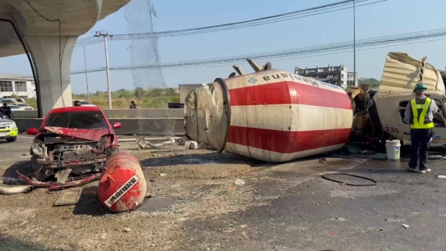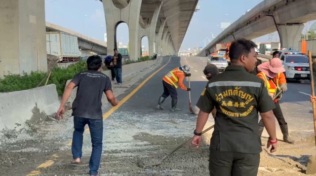 โดยที่เกิดเหตุ เจ้าหน้าที่แขวงการทางหลวงสมุทรปราการ เจ้าหน้าที่ตำรวจ และเจ้าหน้าที่อาสาสมัครมูลนิธิร่วมกตัญญู ต้องช่วยกันกวาดเก็บเศษปูนผสมสำเร็จที่ไหลนองพื้น จำนวนมาก และต้องแข่งกับเวลาเนื่องจากปูนแห้งเร็ว