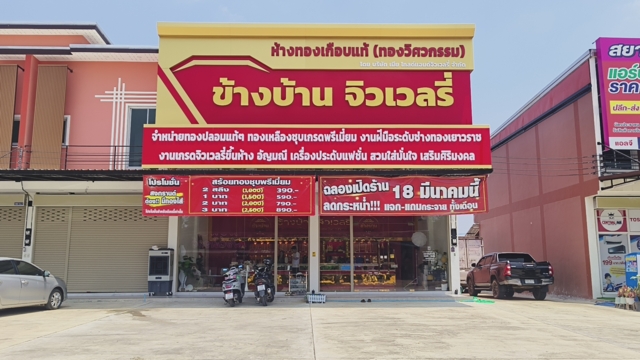 ที่ร้าน “ข้างบ้านจิวเวลรี่ ห้างทองเกือบแท้” ภายในตลาดใหญ่วินเทจ ต.ท่าตูม อ.ศรีมหาโพธิ พบว่า มีการติดป้ายจำหน่ายทองปลอมแท้ๆ ทองเหลืองชุบเกรดพรีเมียม งานฝีมือระดับช่างทองเยาวราช ในราคาหลักร้อยถึงหลักพัน โดยมีโปรโมชั่นช่วงสงกรานต์ เช่น สร้อยคอขนาด 1 บาท ราคาเพียง 590 บาท และ 2 บาท ราคา 790 บาท ทำให้ได้รับความสนใจจากลูกค้าเป็นจำนวนมาก