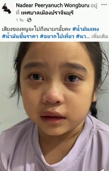 วันที่ 5 เม.ย.2569 เพจ Facebook ที่ใช้ชื่อว่า nadear peeryanuch wongburu ได้โพสต์คลิปของลูกสาววัย 7 ขวบ พร้อมข้อความว่า "เสียงของหนูจะไปถึงนายกมั้ยคะ #น้ำมันแพง #น้ำมันขึ้นราคา #อยากไปเที่ยว #นายก #อนุทิน