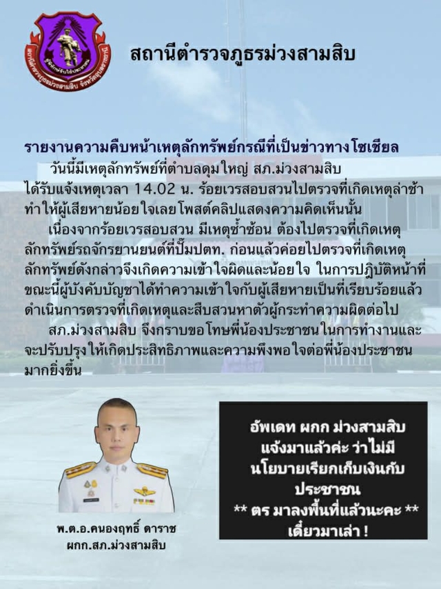 ขณะนี้ผู้บังคับบัญชาได้ทำความเข้าใจกับผู้เสียหายเป็นที่เรียบร้อยแล้ว ดำเนินการตรวจที่เกิดเหตุและสืบสวนหาตัวผู้กระทำผิดต่อไป สภ.ม่วงสามสิบ จึงกราบขอโทษพี่น้องประชาชนในการทำงาน และจะปรับปรุงให้เกิดประสิทธิภาพและความพึงพอใจต่อพี่น้องประชาชนมากยิ่งขึ้น