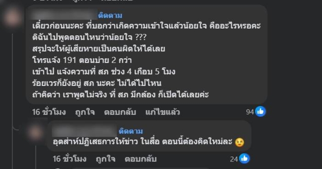 ขณะที่ทางด้านผู้เสียหาย ได้เข้าไปคอมเมนต์ใต้โพสต์ชี้แจงของ สภ.ม่วงสามสิบ ระบุว่า "เดี๋ยวก่อนนะคะ ที่บอกว่าเกิดความเข้าใจแล้วน้อยใจ คืออะไรหรอคะ ดิฉันไปพูดตอนไหนว่าน้อยใจ ??? สรุปจะให้ผู้เสียหายเป็นคนผิดให้ได้เลย โทรแจ้ง 191 ตอนบ่าย 2 กว่า เข้าไป แจ้งความที่ สภ ช่วง 4 เกือบ 5 โมง ร้อยเวรก็ยังอยู่ สภ นะคะ ไม่ได้ไปไหนถ้าคิดว่า เราพูดไม่จริง ที่ สภ มีกล้อง ก็เปิดได้เลยค่ะ