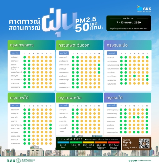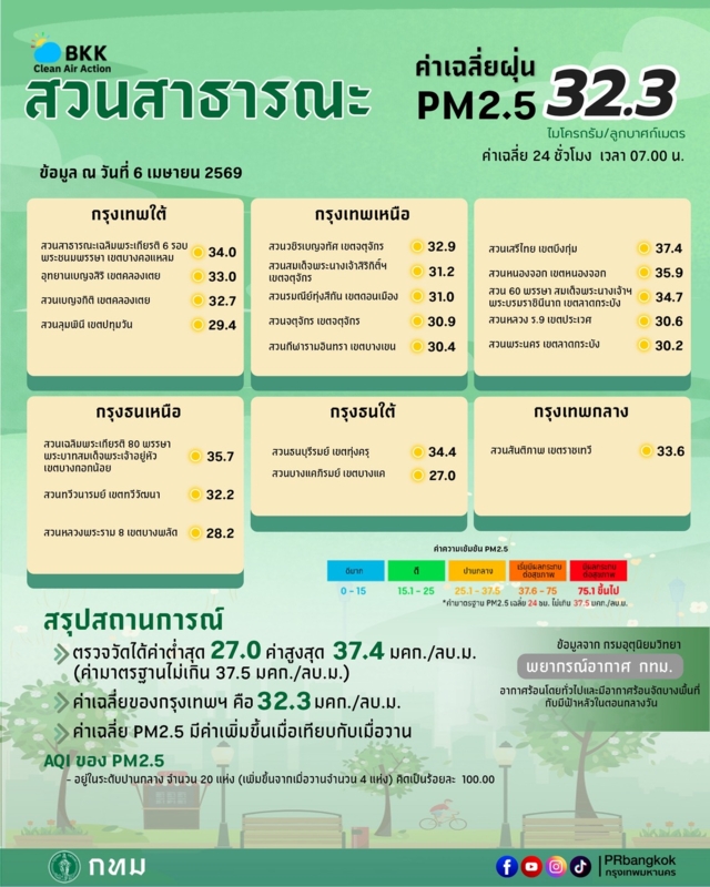(6 เม.ย. 2569) ศูนย์ข้อมูลคุณภาพอากาศกรุงเทพมหานคร ขอรายงานสถานการณ์ฝุ่นละอองขนาดไม่เกิน 2.5 ไมครอน (PM 2.5) ในกรุงเทพมหานคร ประจำวันที่ 6 เม.ย. 2569 เวลา 07:00 น. ค่าเฉลี่ยของกรุงเทพมหานคร 36.5 ไมโครกรัมต่อลูกบาศก์เมตร (มคก./ลบ.ม.) (ค่ามาตรฐานไม่เกิน 37.5 มค.ก./ลบ.ม.)