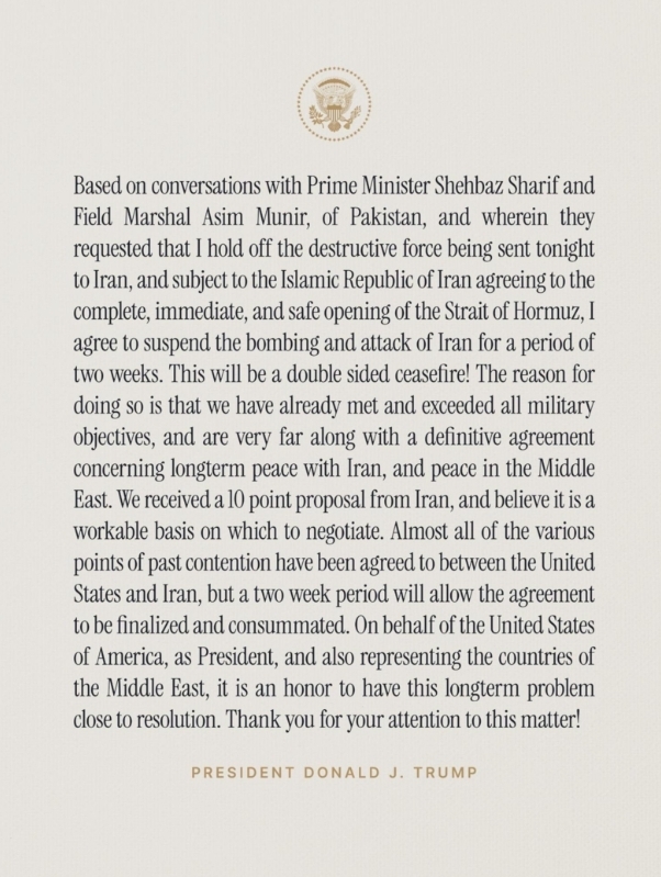วันที่ 8 เม.ย.2569 ตามเวลาประเทศไทย ประธานาธิบดีโดนัลด์ ทรัมป์ แห่งสหรัฐอเมริกา โพสต์บนแพลตฟอร์ม Truth Social ระบุว่า จากการหารือกับนายกรัฐมนตรี เชห์บาซ ชารีฟ และจอมพล อาซิม มูนีร์ แห่งปากีสถาน ซึ่งพวกเขาได้ร้องขอให้ข้าพเจ้าระงับการใช้กำลังทำลายล้างที่เตรียมจะส่งไปยังอิหร่านในคืนนี้ และภายใต้เงื่อนไขที่สาธารณรัฐอิสลามอิหร่านตกลงที่จะเปิดช่องแคบฮอร์มุซอย่างสมบูรณ์ ทันที และอย่างปลอดภัย ข้าพเจ้าตกลงที่จะระงับการทิ้งระเบิดและการโจมตีอิหร่านเป็นระยะเวลาสองสัปดาห์