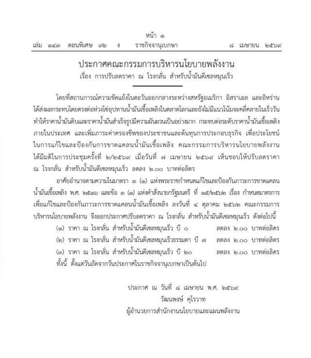 วันที่ 8 เมษายน 2569 เว็บไซต์ราชกิจจานุเบกษา เผยแพร่ ประกาศคณะกรรมการบริหารนโยบายพลังงานเรื่อง การปรับลดราคา ณ โรงกลั่น สำหรับน้ำมันดีเซลหมุนเร็ว ความว่า โดยที่สถานการณ์ความขัดแย้งในตะวันออกกลางระหว่างสหรัฐอเมริกา อิสราเอล และอิหร่านได้ส่งผลกระทบโดยตรงต่อห่วงโซ่อุปทานน้ำมันเชื้อเพลิงในตลาดโลกและยังไม่มีแนวโน้มจะคลี่คลายในเร็ววัน ทำให้ราคาน้ำมันดิบและราคาน้ำมันสำเร็จรูปมีความผันผวนเป็นอย่างมาก กระทบต่อระดับราคาน้ำมันเชื้อเพลิงภายในประเทศ และเพิ่มภาระค่าครองชีพของประชาชนและต้นทุนการประกอบธุรกิจ