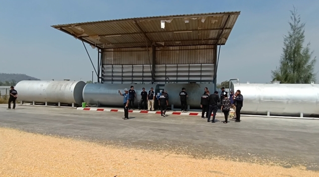 จากการเข้าตรวจสอบก็พบภายในโรงงานนั้นใช้เป็นสถานกักเก็บวัตถุดิบเพื่อนำไปทำอาหารสัตว์ ซึ่งเป็นสินค้าควบคุม เช่นมันเส้น รำข้าว และข้าวโพด นอกจากนี้ยังถังน้ำมันดีเซลขนาดบรรจุจำนวน 20,000 ลิตร จำนวน 5 ถัง ถังขนาดบรรจุจำนวน 18,000 จำนวน 2 ถัง แต่มีน้ำมันเพียงถังเดียว ถังน้ำมันขนาด 15,000 ลิตร จำนวน 1 ถัง และขนาด 9,000 ลิตร อีก 1 ถัง รวมทั้งหมด 9 ถัง มีน้ำมันทั้งหมด 142,000 ลิตร เจ้าหน้าที่จึงได้เก็บตัวอย่างน้ำมันทั้งหมดไปตรวจสอบเพื่อยืนยันให้ชัดว่าของเหลวที่พบในถังนั้นคือน้ำมันดีเซล