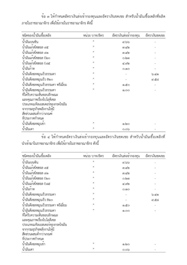 อาศัยอำนาจตามมาตรา ๑๔ (๔) มาตรา ๒๗ มาตรา ๒๙ มาตรา ๓๑ มาตรา ๓๒ มาตรา ๕๔ และมาตรา ๕๕ แห่งพระราชบัญญัติกองทุนน้ำมันเชื้อเพลิง พ.ศ. ๒๕๖๒ คณะกรรมการบริหารกองทุนน้ำมันเชื้อเพลิงประกาศกำหนดอัตราเงินส่งเข้ากองทุน อัตราเงินชดเชย อัตราเงินคืนจากกองทุน และอัตราเงินชดเชยคืนกองทุนสำหรับน้ำมันเชื้อเพลิง ดังต่อไปนี้