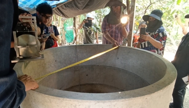 ด้านนายประสิทธิพร จิตต์วารี นายช่างเทคนิคอาวุโส สำนักควบคุมกิจการน้ำบาดาล กรมทรัพยากรน้ำบาดาล บอกว่า น้ำมะพร้าวปลอมคนก็คือฮากันว่า ต้นทางมันเกิดจากบ้านคุณยาย ทางเจ้าหน้าที่รัฐก็อยู่นิ่งไม่ได้เพราะว่าโซเชียลเขาก็ถามว่าหน่วยงานของรัฐทำอะไรกันอยู่ ทำไมไม่มาตรวจสอบทั้งๆที่มี พรบ.ควบคุมกำกับอยู่ วันนี้ก็เลยต้องมา ก็ตรวจสอบตามขั้นตอนของหลักวิชาการ วัดความลึก เก็บตัวอย่างน้ำไปเพื่อเอาไปเข้าห้องแล็บวิเคราะห์ เพราะว่าเราไม่รู้ว่าคนมาเอาน้ำจากคุณยายไปแล้วเขาอาจจะเอาไปทำอะไร เราก็ต้องดูว่าคุณภาพน้ำมันมีสารละลายอะไรที่เกิดผลกระทบต่อสุขภาพหรือสิ่งแวดล้อมหรือไม่ วันนี้ได้มาพิสูจน์แล้ว ความลึกของบ่อไม่เกินตามที่กฎหมายกำหนดคือ ความลึกของบ่อน้ำบาดาลที่จะเข้าตามพรบ.น้ำบาดาล ต้องลึกตั้งแต่ 15 เมตรลงไปก็จะต้องมีการขออนุญาต ซึงก็วัดทั้ง 2 บ่อคือบ่อที่มีความลึก 4 เมตรกว่า และ 5 เมตรกว่า ก็เป็นความโชคดีว่าเราไม่ได้ทำผิดกฎหมายแต่อยากให้ดูแลบ่อให้ดีกว่านี้ เพราะว่าป้องกันปนเปื้อน ซึ่งวันนี้เราดูแค่ค่าความนำไฟฟ้า