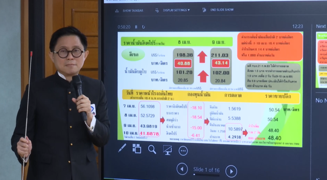 อ.ปานเทพ เปิดเผยว่า จากข้อมูลในวันที่ 8 และ 9 เม.ย. ประเทศไทยอิงราคาน้ำมันจากประเทศสิงคโปร์ เสมือนนำราคาน้ำมันที่กลั่นแล้วขนส่งเข้ามาในประเทศไทยโดยมีค่าขนส่งและค่าประกันภัย ซึ่งไม่มีอยู่จริง เป็นการใช้กำไรที่ไม่เกิดสภาพความเป็นจริง โดยราคาน้ำมันดีเซลวันที่ 8 เม.ย. คิดเป็น 198.36 เหรียญต่อบาร์เรน หรือ 40.86 บาทต่อลิตร และวันที่ 9 เม.ย. เพิ่มขึ้นเป็น 211.03 เหรียญต่อบาร์เรน หรือ 43.14 บาท ตามราคาตลาดโลก และปกติราคาน้ำมันหน้าโรงกลั่นในไทยจะคิดย้อนหลัง 2 วัน จากค่าเฉลี่ยก่อนหน้า ดังนั้นจะเห็นว่าราคาน้ำมันหน้าโรงกลั่นวันที่ 7-9 เม.ย. หากอิงตามราคาน้ำมันของสิงคโปร์ลดลงเรื่อย ๆ เหลือ 41.68 บาท และจากภาพรวมข้อมูลทั้งหมดสรุปได้ว่ามีการนำกำไรเกินสมควรเกินกว่ามติคณะกรรมการบริหารนโยบายพลังงาน หรือ กบง. ทั้ง 2 วัน ไป 800 ล้านบาท