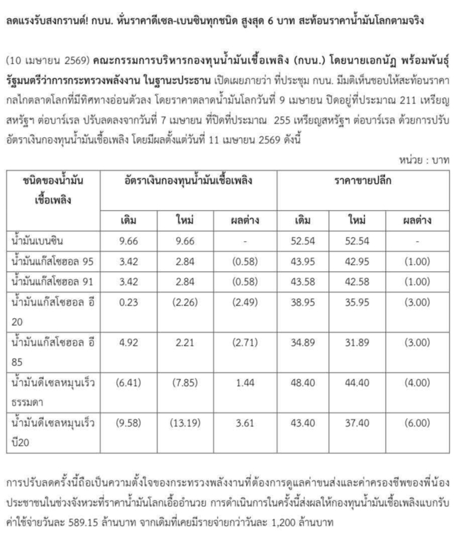 สรุปราคาน้ำมันพรุ่งนี้ 11/04/69