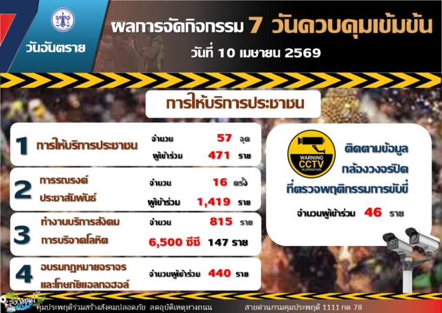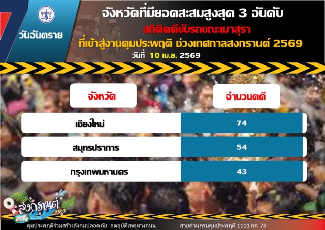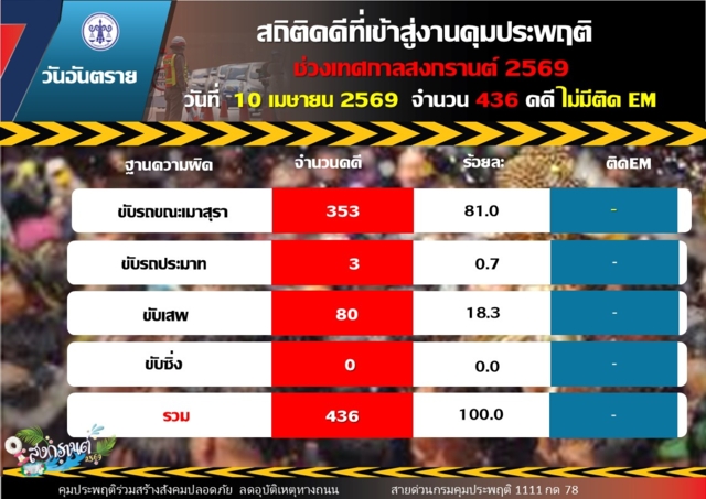 (11 เม.ย. 2569) ร้อยตำรวจเอก ปิยะ รักสกุล อธิบดีกรมคุมประพฤติ เปิดเผยสถิติคดีที่ศาลสั่งคุมความประพฤติในวันแรก (10 เม.ย. 2569) ของการรณรงค์ป้องกันและลดอุบัติเหตุทางถนนช่วงเทศกาลสงกรานต์ 2569 พบว่ามีคดีเข้าสู่กระบวนการคุมความประพฤติรวมทั้งสิ้น 436 คดี แบ่งเป็น คดีขับรถในขณะเมาสุรา 353 คดี คิดเป็นร้อยละ 81 คดีขับรถประมาท 3 คดี คิดเป็นร้อยละ 0.7 และคดีขับเสพ 80 คดี คิดเป็นร้อยละ 18.3 โดยจังหวัดที่มีสถิติคดีขับรถขณะเมาสุราสูงสุด 3 อันดับแรก ได้แก่ เชียงใหม่ 74 คดี สมุทรปราการ 54 คดี และกรุงเทพมหานคร 43 คดี