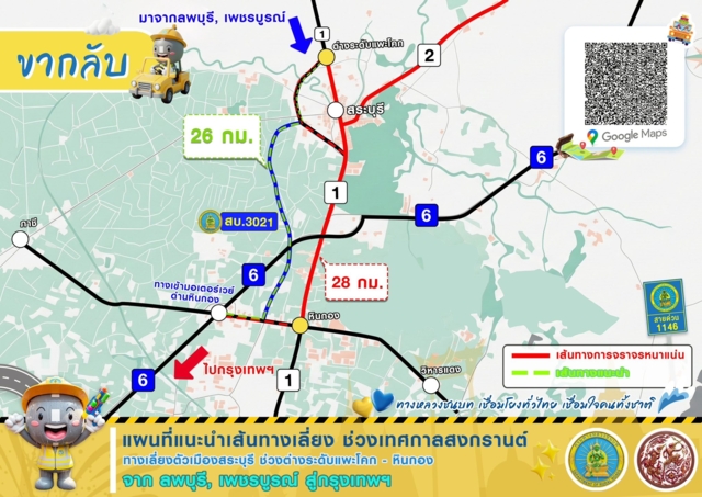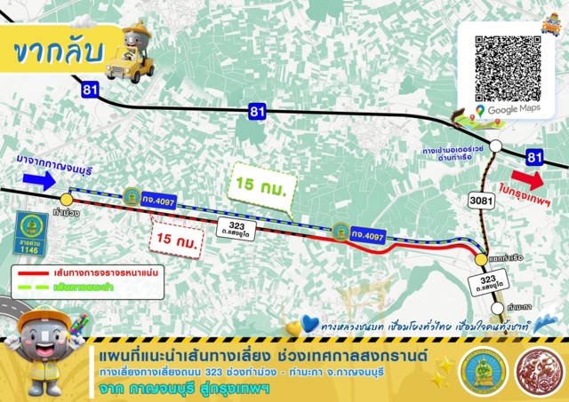 นอกจากนี้ ทช. ยังได้ดำเนินการติดตั้งป้ายเตือน ป้ายแนะนำเส้นทางเลี่ยงตามโครงข่ายทางหลวงชนบท เพื่ออำนวยความสะดวกปลอดภัยในการเดินทางให้กับประชาชน ทั้งนี้ หากต้องการความช่วยเหลือหรือสอบถามข้อมูลเพิ่มเติมติดต่อได้ที่เจ้าหน้าที่แขวงทางหลวงชนบทในพื้นที่ หรือสายด่วน ทช. โทร. 1146