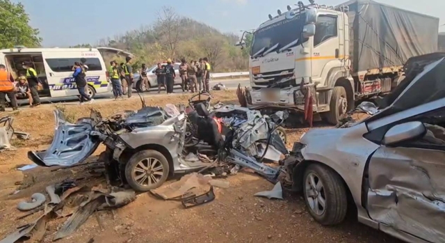 ในที่เกิดเหตุพบรถหลายประเภท ทั้งรถกระบะ Mazda สีดำ รถเก๋ง Honda หลายคัน รวมถึงรถ Toyota สีขาว และรถพ่วง 18 ล้อบรรทุกสุขภัณฑ์ ทะเบียนจังหวัดสระบุรี ซึ่งเป็นต้นเหตุของอุบัติเหตุครั้งนี้