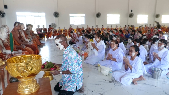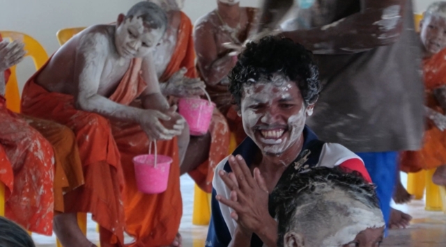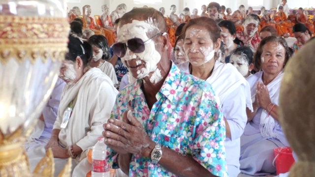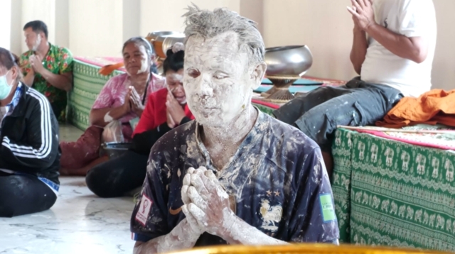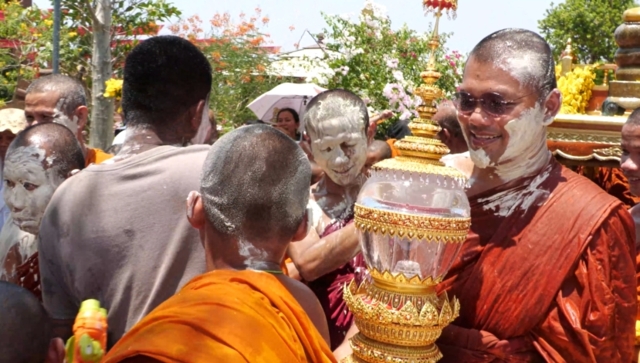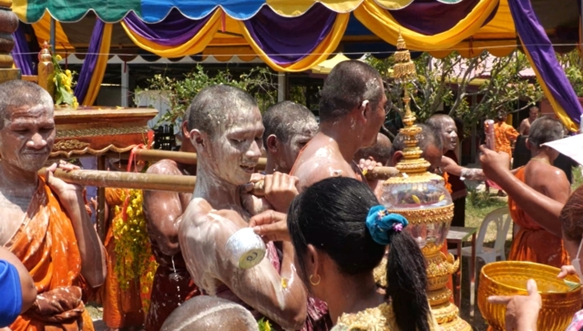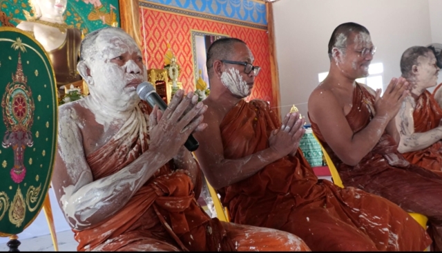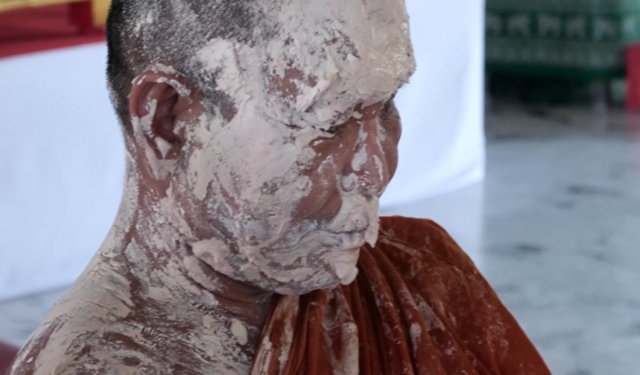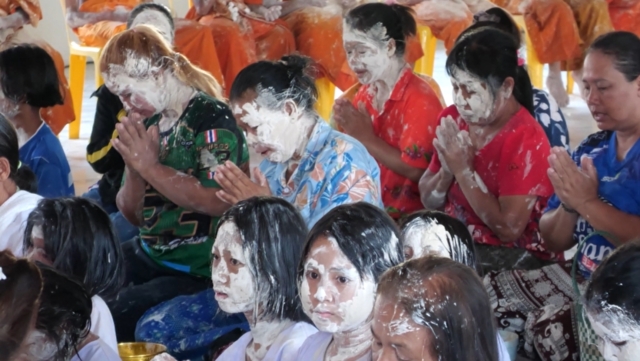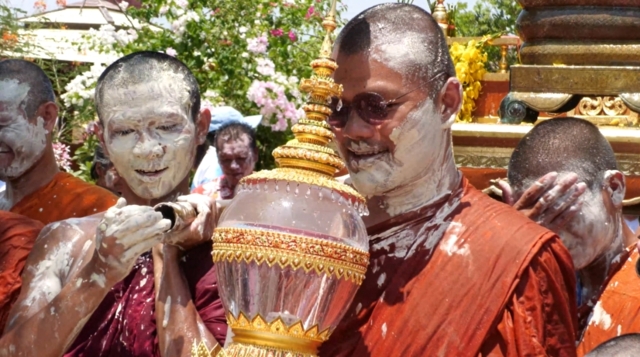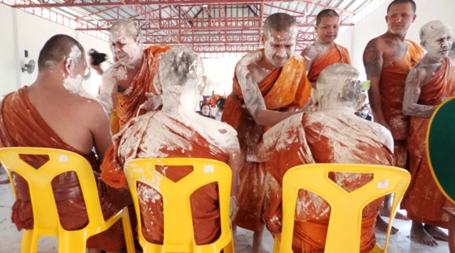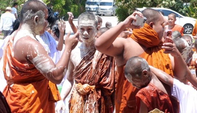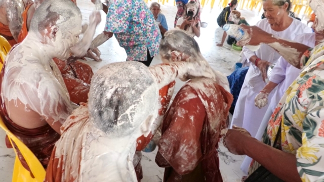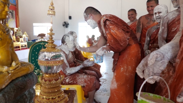 จากจีวรสีเหลืองอร่าม กลายเป็นสีขาวโพลนในเวลาไม่นาน พระเณรหลายรูปถูกแป้งจับจนแทบจำไม่ได้ เห็นเด่นชัดเพียงดวงตากับรอยยิ้ม บางรูปถึงกับแซวกันเองว่า สงกรานต์ปีนี้เหมือนพระเณรชุบแป้งทอดมาทั้งขบวน