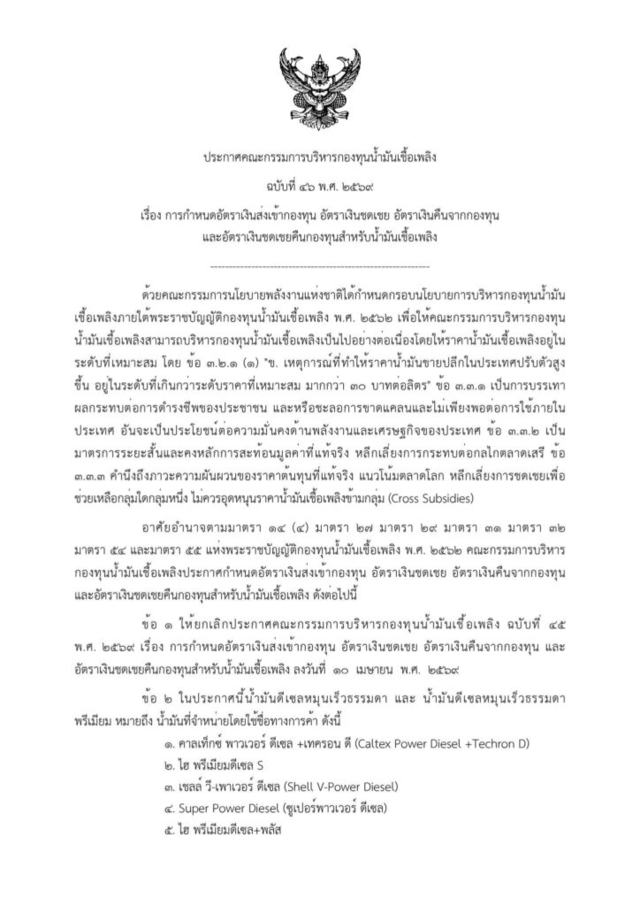 ประกาศคณะกรรมการบริหารกองทุนน้ำมันเชื้อเพลิง ฉบับที่ ๔๖ พ.ศ. ๒๕๖๙ เรื่อง การกำหนดอัตราเงินส่งเข้ากองทุน อัตราเงินชดเชย อัตราเงินคืนจากกองทุนและอัตราเงินชดเชยคืนกองทุนสำหรับน้ำมันเชื้อเพลิง