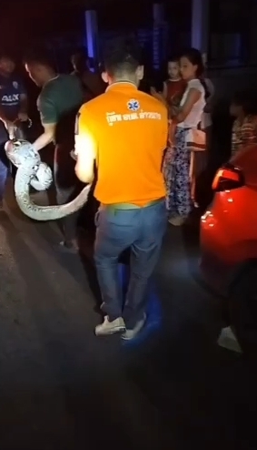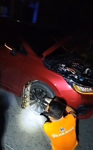 ทำให้ทางชาวบ้านต้องติดต่อไปที่นายสุธี แนวหาด หรือ บังฉาบองหลามือเปล่า นักจับงูชื่อดัง เป็น เจ้าหน้าที่กู้ชีพของ อบต.อ่าวนาง ให้มาช่วยจับงู ตรวจสอบพบงูเหลือมขนาดใหญ่ ยาวร่วม 4 เมตร นอนขดอยู่ตรงซุ้มล้อหน้าของรถ ทีมงานบังฉา พยายามจะจับงูออกมาอย่างยากลำบาก ใช้เวลาอยู่นานร่วมครึ่ง ชม. จึงนำงูออกมาได้ นำตัวใส่กระสอบไปปล่อยคืนป่า