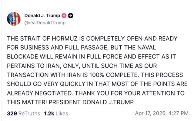 ทรัมป์ ระบุว่า "ช่องแคบฮอร์มุซเปิดสัญจรอย่างสมบูรณ์และพร้อมสำหรับการทำธุรกิจและผ่านทางได้ทุกกรณี" อย่างไรก็ตาม ผู้นำสหรัฐฯ ยังคงท่าทีแข็งกร้าวต่อรัฐบาลเตหะราน โดยย้ำว่า "มาตรการปิดกั้นทางเรือ (Naval Blockade) จะยังคงมีผลบังคับใช้อย่างเต็มที่เฉพาะกับอิหร่านเท่านั้น" จนกว่าข้อตกลงร่วมกันระหว่างสหรัฐฯ และอิหร่านจะเสร็จสมบูรณ์ 100 %
