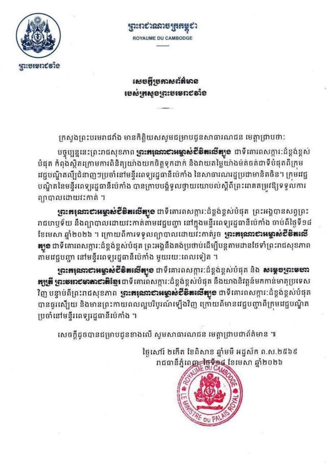 (18 เม.ย. 2569) สำนักพระราชวังกัมพูชาออกแถลงการณ์สำคัญ ระบุว่า พระบาทสมเด็จพระนโรดม สีหมุนี กษัตริย์แห่งกัมพูชา ได้เสด็จพระราชดำเนินไปประทับ ณ โรงพยาบาลกรุงปักกิ่ง สาธารณรัฐประชาชนจีน เพื่อทรงรับการตรวจพระวรกายอย่างละเอียดจากคณะแพทย์ผู้เชี่ยวชาญระดับสูง