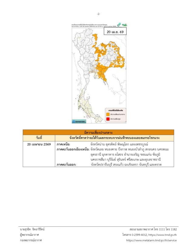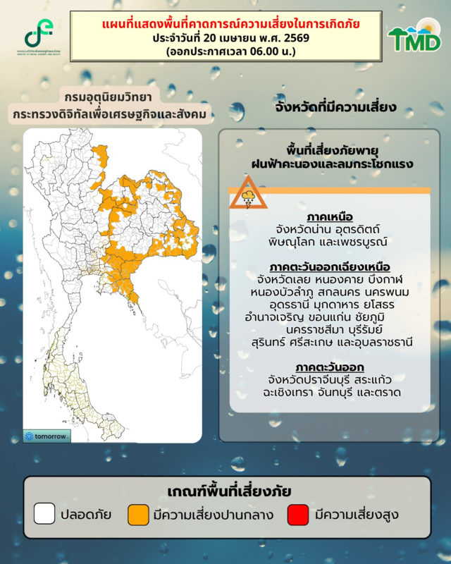 กรมอุตุนิยมวิทยา ประกาศเตือน เรื่อง พายุฤดูร้อนบริเวณประเทศไทยตอนบน (มีผลกระทบจนถึงวันที่ 20 เมษายน 2569) ฉบับที่ 12 บริเวณภาคเหนือ ภาคตะวันออกเฉียงเหนือ และภาคตะวันออกยังคงมีพายุฤดูร้อนเกิดขึ้นได้ในบางพื้นที่ ซึ่งมีลักษณะของพายุฝนฟ้าคะนอง ลมกระโชกแรง ลูกเห็บตกบางแห่ง รวมถึงอาจมีฟ้าผ่าเกิดขึ้นได้บางพื้นที่ เนื่องจากลมใต้และลมตะวันออกเฉียงใต้พัดนำความชื้นจากอ่าวไทยและทะเลจีนใต้เข้ามาปกคลุมภาคตะวันออกเฉียงเหนือ ภาคตะวันออก และอ่าวไทยตอนบน ในขณะที่บริเวณประเทศไทยมีอากาศร้อนถึงร้อนจัด