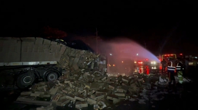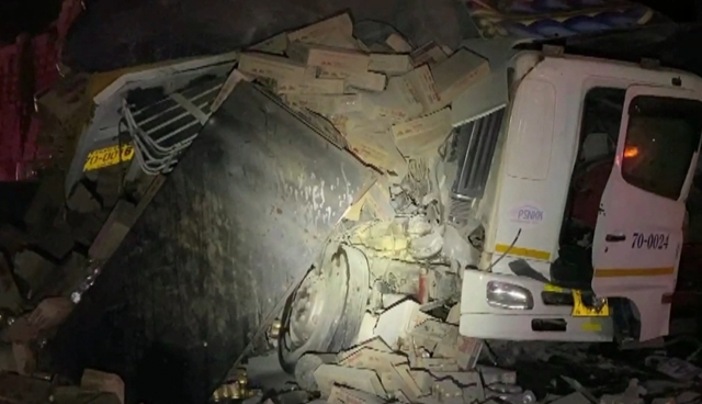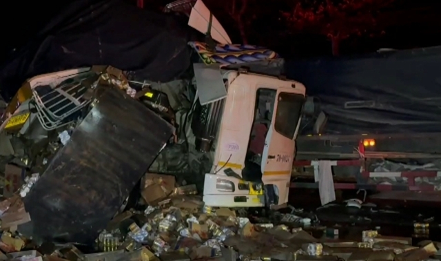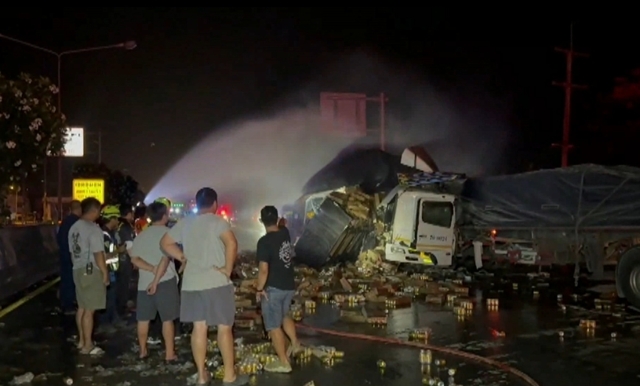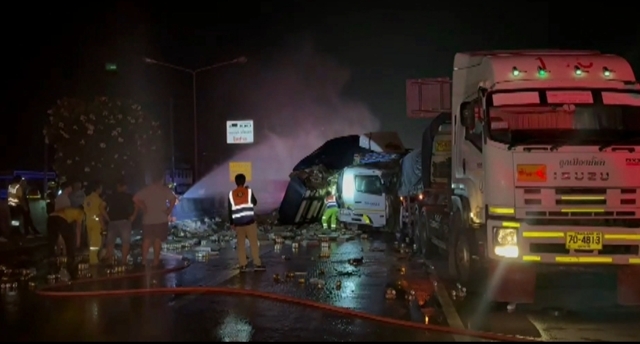 ที่เกิดเหตุพบรถเทรลเลอร์บรรทุกเครื่องดื่มชูกำลัง ชนท้ายรถเทรลเลอร์บรรทุกปูนซึ่งจอดเสียอยู่ข้างทาง แรงกระแทกทำให้สินค้าที่บรรทุกมากระแทกเข้ากับหัวเก๋งจนพังเสียหาย และหลุดร่วงลงมา