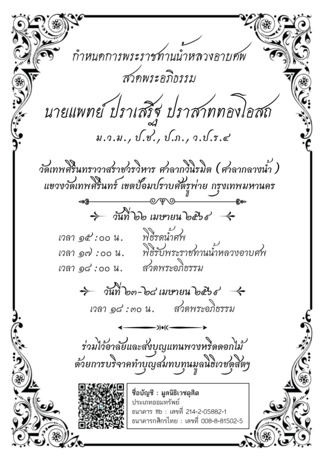ในวันที่ 22 เมษายน 2569 เวลา 15.00 น. พิธีรดน้ำศพ เวลา 17.00 น. พิธีรับพระราชทานน้ำหลวงอาบศพ และเวลา 18.00 น. สวดพระอภิธรรม และวันที่ 23-28 เมษายน 2569 สวดพระอภิธรรม ในเวลา 18.30 น.