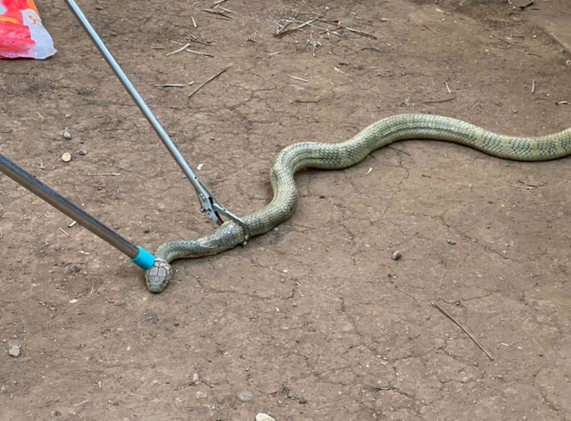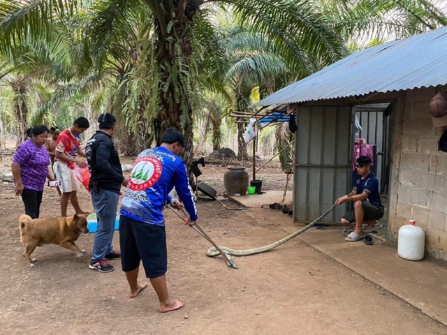 เจ้าหน้าที่ใช้อุปกรณ์จับสัตว์เลื้อยคลานเข้าดำเนินการอย่างระมัดระวัง ใช้เวลาประมาณ 5 นาที จึงสามารถควบคุมตัวงูไว้ได้อย่างปลอดภัย ก่อนนำไปปล่อยคืนสู่ธรรมชาติ