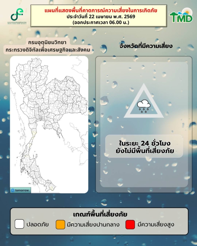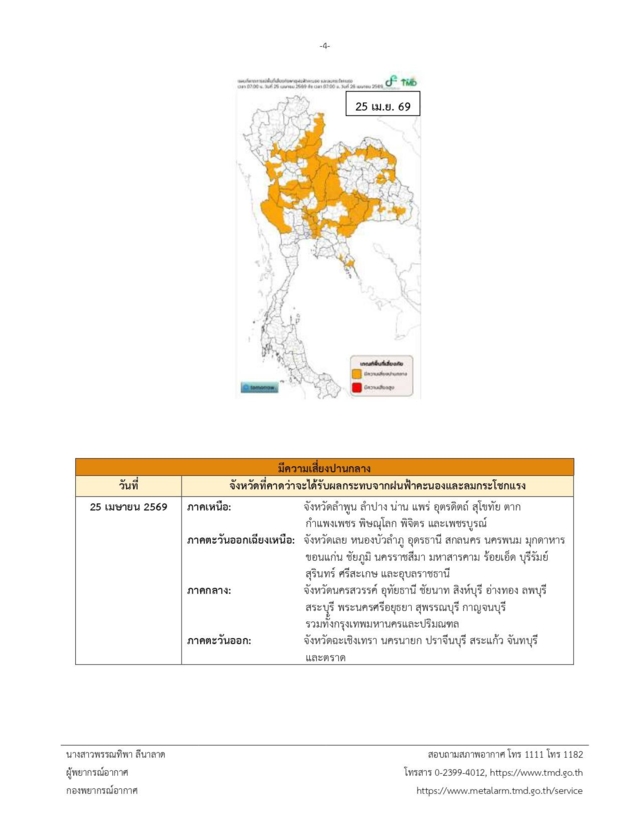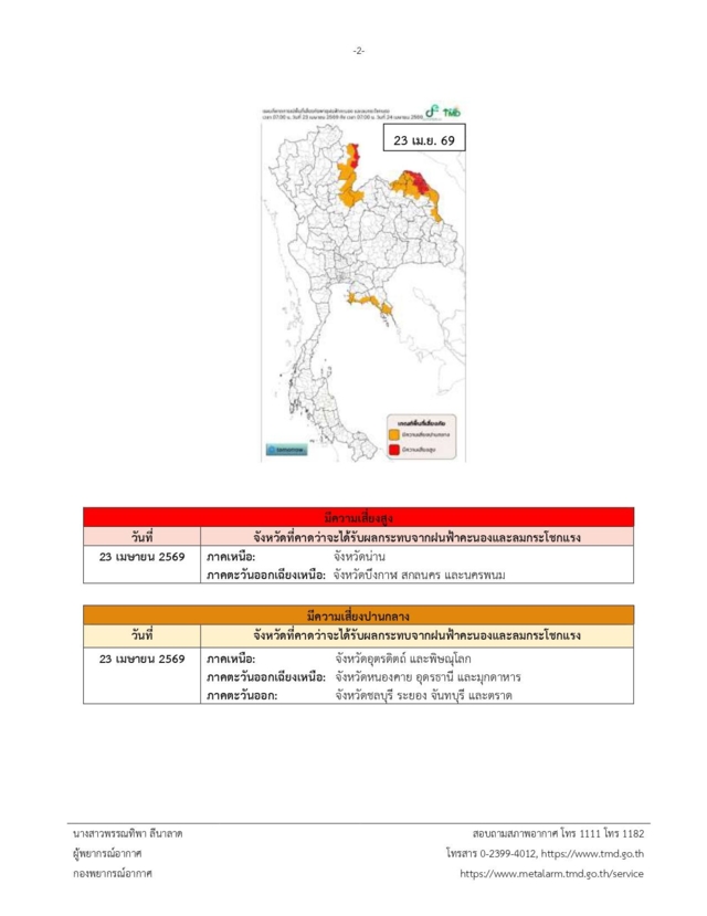 กรมอุตุนิยมวิทยา ประกาศเตือน เรื่อง พายุฤดูร้อนบริเวณประเทศไทยตอนบน (มีผลกระทบตั้งแต่วันที่ 23-25 เม.ย. 2569) ฉบับที่ 2 ในช่วงวันที่ 23-25 เม.ย. 2569 ประเทศไทยตอนบนจะมีพายุฤดูร้อนเกิดขึ้น โดยมีลักษณะของพายุฝนฟ้าคะนอง ลมกระโชกแรง ฟ้าผ่า และลูกเห็บตกบางพื้นที่ โดยจะเริ่มจากภาคเหนือ ภาคตะวันออกเฉียงเหนือ และภาคตะวันออกก่อนส่วนภาคกลาง รวมทั้งกรุงเทพมหานครและปริมณฑล จะได้รับผลกระทบในระยะถัดไป เนื่องจากบริเวณความกดอากาศสูงหรือมวลอากาศเย็นจากประเทศจีนจะแผ่ลงมาปกคลุมภาคตะวันออกเฉียงเหนือและทะเลจีนใต้ ในขณะที่ประเทศไทยตอนบนมีอากาศร้อนถึงร้อนจัดโดยทั่วไป