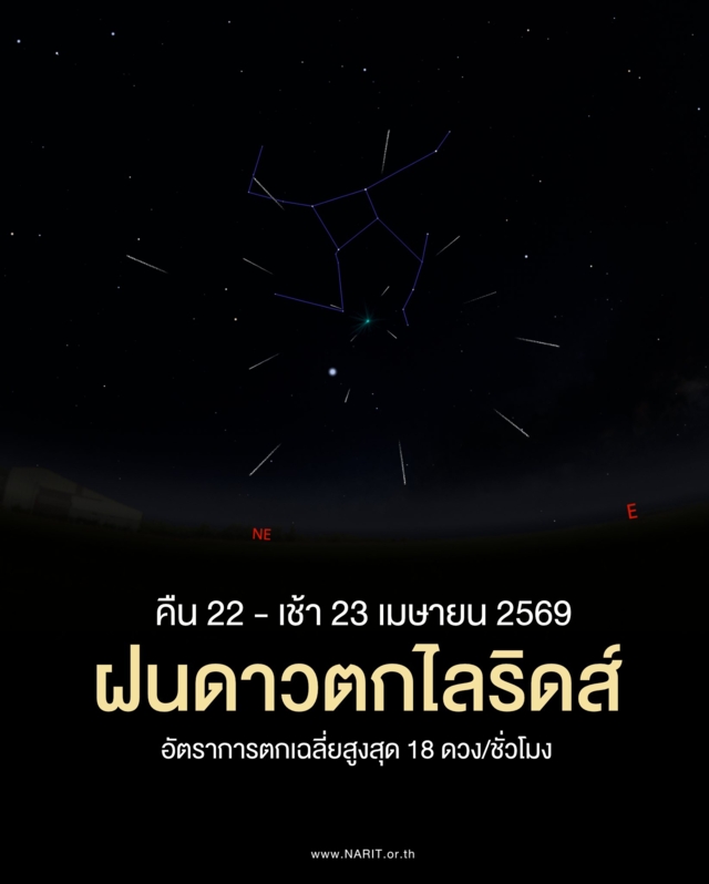 NARIT สถาบันวิจัยดาราศาสตร์แห่งชาติ ชวนชม "ฝนดาวตกไลริดส์" โดยเริ่มสังเกตได้เวลาประมาณ 22:00 น. ทางทิศตะวันออกเฉียงเหนือ ของวันที่ 22 เม.ย. 2569 เป็นต้นไป จนถึงรุ่งเช้าของวันที่ 23 เม.ย. 2569 ศูนย์กลางการกระจายตัวอยู่ระหว่างบริเวณกลุ่มดาวเฮอร์คิวลิสกับกลุ่มดาวพิณ (คาดว่าจะมีอัตราการตกสูงสุดเฉลี่ย 18 ดวงต่อชั่วโมง เวลา 02:40 น. ของวันที่ 23 เม.ย. 2569) การชมฝนดาวตกสามารถสังเกตการณ์ได้ทั่วประเทศหากฟ้าใสไร้เมฆฝน แนะนำดูในบริเวณที่มืดสนิทปราศจากแสงรบกวน
