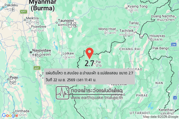 (22 เม.ย. 2569) กองเฝ้าระวังแผ่นดินไหว กรมอุตุนิยมวิทยา ได้ประกาศ แผ่นดินไหว ในพื้นที่ ต.สบป่อง อ.ปางมะผ้า จ.แม่ฮ่องสอน ประเทศไทย วันนี้ (22 เม.ย. 2569) เวลา 11.41 น. ขนาด 2.7 ความลึก 2 กิโลเมตร ยังไม่มีรายงานความเสียหาย