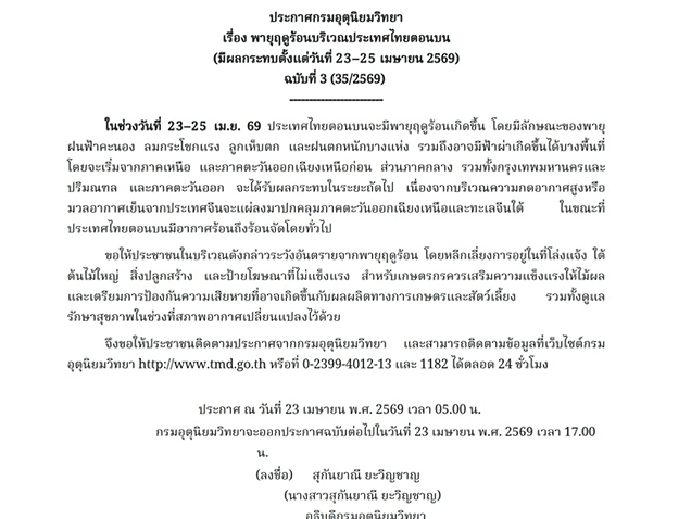 โดยกรมอุตุนิยมได้ออกประกาศกรมอุตุนิยมวิทยา เรื่อง พายุฤดูร้อนบริเวณประเทศไทยตอนบน (มีผลกระทบตั้งแต่วันที่ 23–25 เม.ย. 69) ฉบับที่ 3 (35/2569)