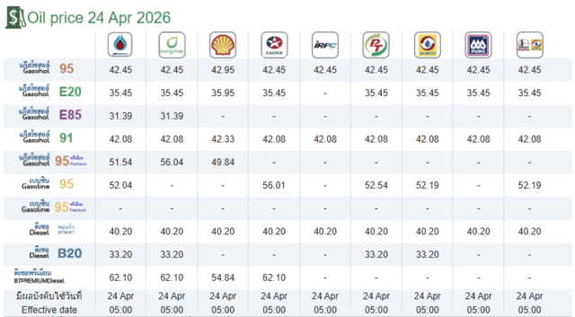 - ดีเซล : ราคา 40.20 บาท/ลิตร