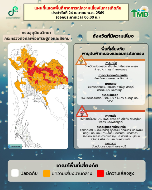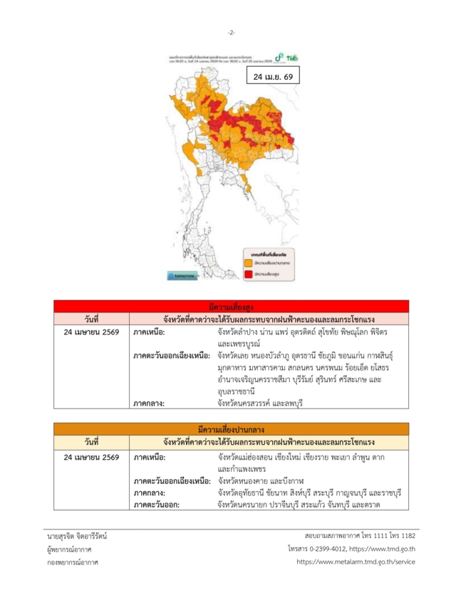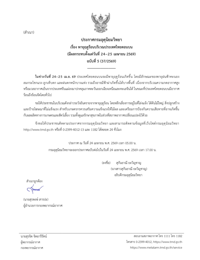 กรมอุตุนิยมวิทยา ประกาศเตือน เรื่อง พายุฤดูร้อนบริเวณประเทศไทยตอนบน (มีผลกระทบตั้งแต่วันที่ 24-25 เม.ย. 2569) ฉบับที่ 5 ในช่วงวันที่ 24-25 เม.ย. 2569 ประเทศไทยตอนบนจะมีพายุฤดูร้อนเกิดขึ้น โดยมีลักษณะของพายุฝนฟ้าคะนอง ลมกระโชกแรง ลูกเห็บตก และฝนตกหนักบางแห่ง รวมถึงอาจมีฟ้าผ่าเกิดขึ้นได้บางพื้นที่ เนื่องจากบริเวณความกดอากาศสูง หรือมวลอากาศเย็นจากประเทศจีนแผ่ลงมาปกคลุมภาคตะวันออกเฉียงเหนือและทะเลจีนใต้ ในขณะที่ประเทศไทยตอนบนมีอากาศร้อนถึงร้อนจัดโดยทั่วไป