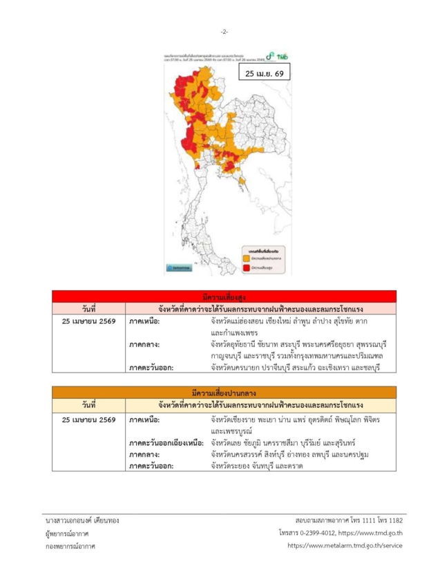 กรมอุตุนิยมวิทยา ประกาศเตือน เรื่อง พายุฤดูร้อนบริเวณประเทศไทยตอนบน (มีผลกระทบจนถึงวันที่ 25 เมษายน 2569) ฉบับที่ 7 บริเวณด้านตะวันตกและตอนล่างของภาคตะวันออกเฉียงเหนือ ภาคเหนือ ภาคกลาง รวมทั้งกรุงเทพมหานครและปริมณฑล และภาคตะวันออก จะมีพายุฤดูร้อนเกิดขึ้น โดยมีลักษณะของพายุฝนฟ้าคะนอง ลมกระโชกแรง ลูกเห็บตก และฝนตกหนักบางแห่ง รวมถึงอาจมีฟ้าผ่าเกิดขึ้นได้บางพื้นที่ เนื่องจากบริเวณความกดอากาศสูงหรือมวลอากาศเย็นจากประเทศจีนแผ่ลงมาปกคลุมภาคตะวันออกเฉียงเหนือและทะเลจีนใต้ ในขณะที่ประเทศไทยตอนบนมีอากาศร้อนโดยทั่วไป