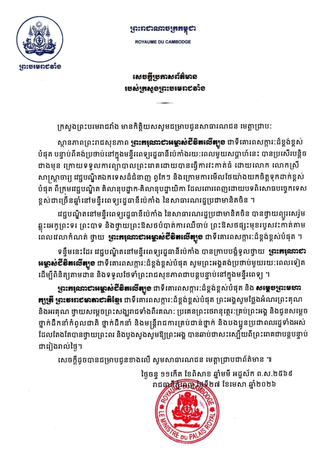 สำนักพระราชวังกัมพูชา ออกแถลงการณ์ เมื่อวันที่ 27 เมษายน 2569 ระบุว่า พระพลานามัยของ พระบาทสมเด็จพระนโรดม สีหมุนี กษัตริย์แห่งกัมพูชา หลังจากประทับในโรงพยาบาลปักกิ่งแคปิตอลเป็นเวลาหนึ่งสัปดาห์ ทรงดีขึ้นเล็กน้อย หลังจากทรงได้รับการรักษาพระอาการประชวรด้วยการผ่าตัดใหญ่โดยแพทย์ผู้เชี่ยวชาญและมีประสบการณ์สูง และได้รับการดูแลอย่างดีที่สุดจากทีมพยาบาลที่มีประสบการณ์และทักษะทางเทคนิคสูง ณ โรงพยาบาลปักกิ่งแคปิตอล แห่งสาธารณรัฐประชาชนจีน