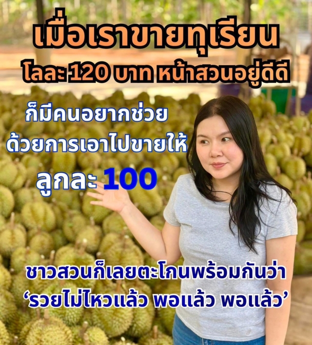 โดย น.ส.วริสา ระบุข้อความว่า กลายเป็นเรื่องที่ชาวสวนทุเรียนอึ้งที่สุดในเช้าวันนี้‘ทุเรียนลูกละ 100 บาท’ ล้านลูก โดยคุณศุภจีและพิมรี่พาย จะขายในไลฟ์สด 28 เมษายนนึ้