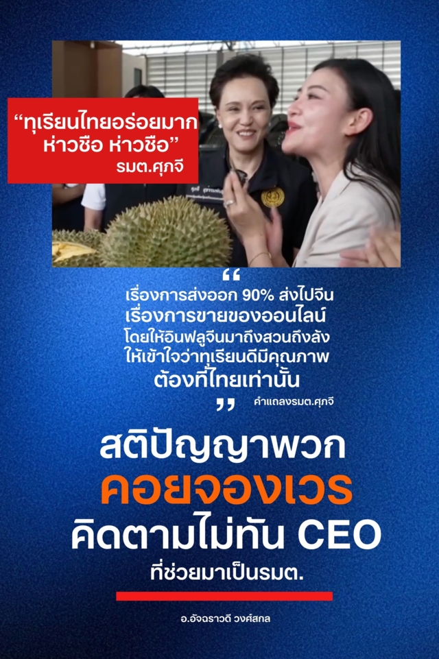 (28 เม.ย. 2569) จากกรณีกระแสดรามา "ขายทุเรียนลูกละ 100" ซึ่งทาง นางศุภจี สุธรรมพันธุ์ รองนายกรัฐมนตรี และรัฐมนตรีว่าการกระทรวงพาณิชย์ จะร่วมไลฟ์สดขายทุเรียนกับ "พิมรี่พาย" จนเกิดกระแสต่อต้านจากหลายด้าน ทั้งคนซื้อและชาวสวนบางส่วน ที่มองว่ายังไงราคานี้ก็ขาดทุน คนปลูกจะได้อะไร