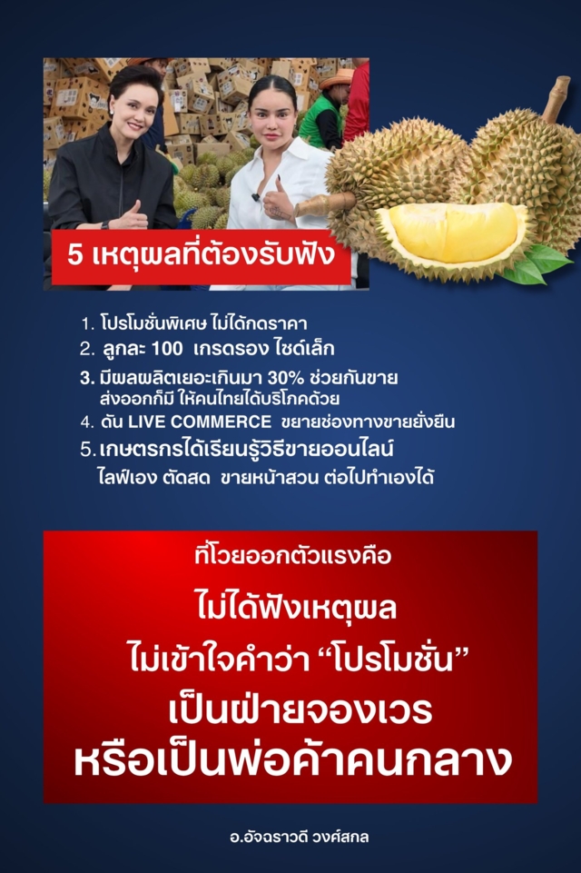 สินค้าโปรโมชั่นคือการขายชั่วคราวและขายล๊อตใหญ่ จะมาเทียบราคาของขายปลีกไม่ได้ เจตนาทั้งหมดนั้นเลิศมากแต่ก็ย่อมกระทบคนอื่น ฝาก รมต.ศุภจี หากเห็นว่า "ได้" มากกว่า "เสีย" แล้ว ก่อนจะลุย บอกฝั่งที่เสียประโยชน์ล่วงหน้า อย่างน้อยก็เพื่อลดกระแสต้านหนุนให้ทำงานเชิงรุกต่อไป งานนี้โดน Tall Poppy Syndrome หรืออาการอิจฉาคนโดดเด่นกว่าเข้าเต็มรักไม่ว่าใครจะอยู่ฝั่งไหนช่วยสนับสนุนทุเรียนไทย และผลิตภัณฑ์เกษตรไทยกันดีกว่า