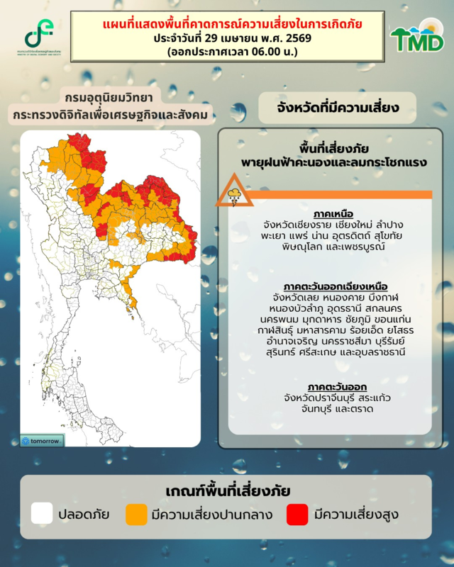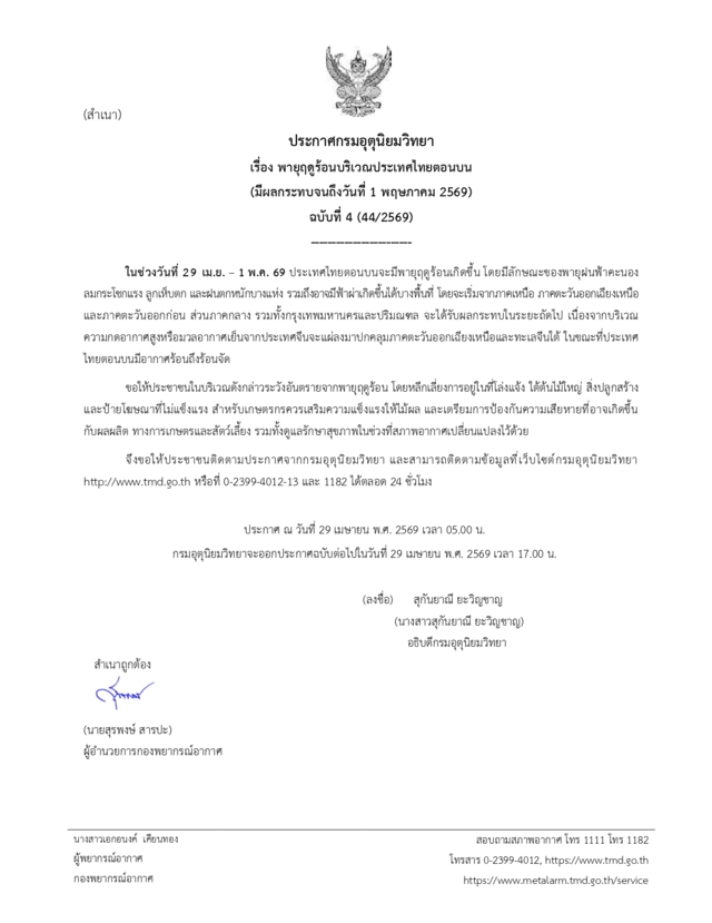 กรมอุตุนิยมวิทยา ประกาศเตือน เรื่อง พายุฤดูร้อนบริเวณประเทศไทยตอนบน (มีผลกระทบตั้งแต่วันที่ 29 เม.ย. - 1 พ.ค. 2569) ฉบับที่ 4 ในช่วงวันที่ 29 เม.ย. - 1 พ.ค. 2569 ประเทศไทยตอนบนจะมีพายุฤดูร้อนเกิดขึ้น โดยมีลักษณะของพายุฝนฟ้าคะนอง ลมกระโชกแรง ลูกเห็บตก และฝนตกหนักบางแห่ง รวมถึงอาจมีฟ้าผ่าเกิดขึ้นได้บางพื้นที่ โดยจะเริ่มจากภาคเหนือ ภาคตะวันออกเฉียงเหนือ และภาคตะวันออกก่อน ส่วนภาคกลาง รวมทั้งกรุงเทพมหานครและปริมณฑล จะได้รับผลกระทบในระยะถัดไป เนื่องจากบริเวณความกดอากาศสูงหรือมวลอากาศเย็นจากประเทศจีนจะแผ่ลงมาปกคลุมภาคตะวันออกเฉียงเหนือและทะเลจีนใต้ ในขณะที่ประเทศไทยตอนบนมีอากาศร้อนถึงร้อนจัด
