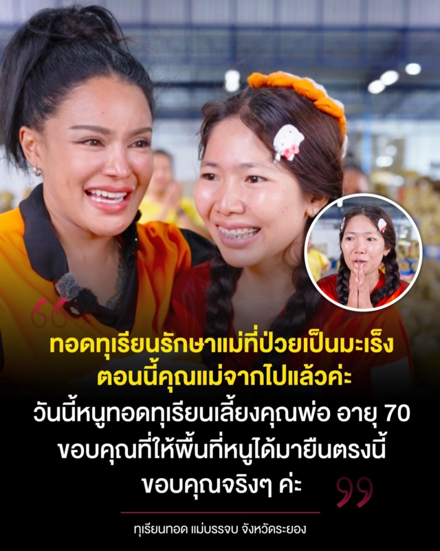 และอีกโพสต์จากลูกสาวของร้านทุเรียนทอดแม่บรรจบ จ.ระยอง ระบุว่า “ทุเรียนทอด เป็นธุรกิจครอบครัวของหนู คุณพ่อ คุณแม่ ริเริ่ม ตั้งใจทำมา 10 ปีแล้วค่ะ อาชีพนี้ คืออาชีพที่ส่งหนูเรียนจนจบ และเป็นอาชีพที่ดูแลคุณแม่ที่ป่วยเป็นมะเร็ง รักษาอยู่ประมาณ 4 ปี คุณแม่พึ่งเสียไปปีที่แล้วค่ะ ตอนนี้หนูอยู่กับคุณพ่อ อายุ 70 กว่า ยังคงทอดทุเรียนอยู่ และตอนนี้หนูทำทุเรียนทอดเป็นอาชีพ ที่เลี้ยงดูคุณพ่อตอนนี้ค่ะ เรามีหน้าร้านอยู่ตลาดตะพง จังหวัดระยอง พวกเราตั้งใจทำ และใช้แต่ของดีมีคุณภาพ วัตถุดิบจากจันทบุรี และจังหวัดระยอง เนื้อดี เกรดดี ที่สุด ขอบคุณมากๆ ที่ให้โอกาสหนูมายืนอยู่ตรงนี้ ขอบคุณจริงๆค่ะ”