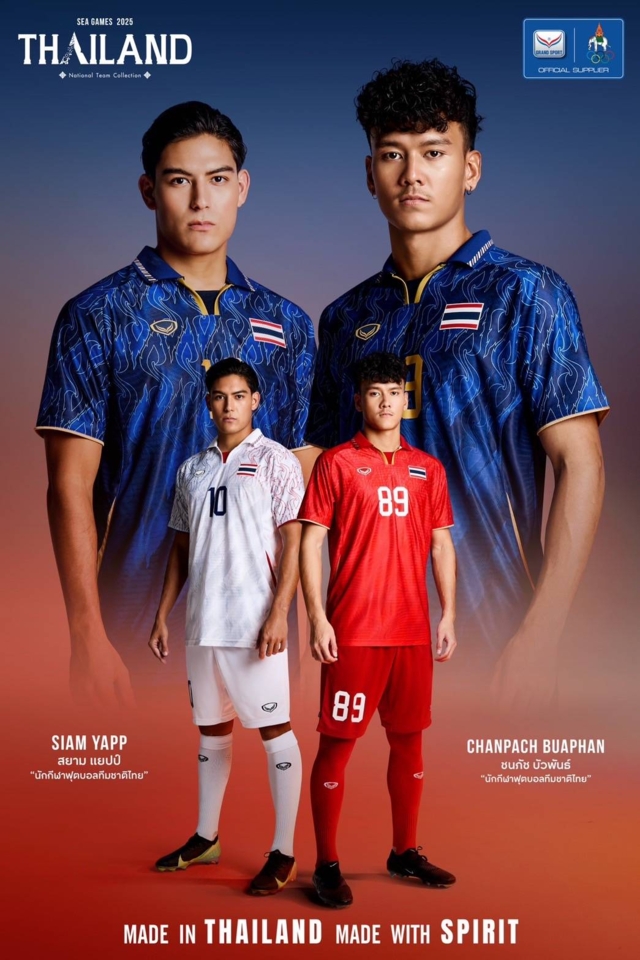 สำหรับแนวคิด "Made in Thailand, Made with Spirit" แกรนด์สปอร์ตได้นำมาร้อยเรียงในเสื้อแข่งขัน และชุดเดินทางของคณะนักกีฬา อย่าง เสื้อฟุตบอลทีมชาติไทยในซีเกมส์ครั้งนี้ ทางแกรนด์สปอร์ต ได้นำความเป็นไทย นำ ลายกนกไทย ผสมผสานกับ ลายเปลวไฟ สัญลักษณ์แห่งพลัง ความกล้า และการต่อสู้ ลวดลายเปลวไฟที่ไล่เฉดจากด้านบนลงมา สร้างมิติและความโดดเด่น ปกเสื้อทอลายแถบสีทอง-ขาว เสริมความสง่างาม อกซ้ายติดธงชาติไทย ผลิตด้วยเทคโนโลยี AIRFLOW TECHNOLOGY เทคนิคการทอแบบ MICRO FULL JACQUARD ทำให้ระบายอากาศดี แห้งไว น้ำหนักเบา รองรับทุกการเคลื่อนไหว มีทั้งหมด 3 สี คือ สีน้ำเงิน สีแดง และสีขาว
