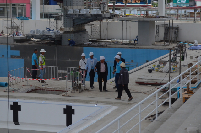 นายธนาวิชญ์ โถสกุล เลขาธิการสมาคมกีฬาทางน้ำแห่งประเทศไทย เปิดเผยว่า จากการตรวจสอบวันนี้ก็ยืนยันได้เลยว่าการก่อสร้าง ปรับปรุง ตกแต่ง เป็นไปตามทามไลน์ ที่ทาง กกท.กำหนดไว้ทุกอย่าง ตอนนี้อุปกรณ์ที่เราสั่งมาจากต่างประเทศก็มารอพร้อมประกอบแล้ว และที่เรามั่นใจว่าเสร็จทันซีเกมส์เพราะการก่อสร้างเป็นรูปแบบใหม่ จะใช้การปูพื้นยางแทนการติดกระเบื้อง อีกทั้งมีผู้เชี่ยวชาญจากสิงคโปร์เข้ามาติดตามการก่อสร้างโดยตลอด ขอให้ทุกคนมั่นใจว่าต้องเสร็จทันซีเกมส์