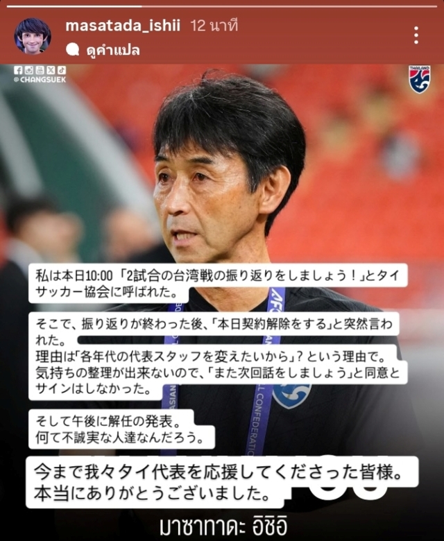 มาซาทาดะ อิชิอิ โพสต์เดือดสวนกลับ สมาคมฟุตบอลไทย ไม่จริงใจ หลังประกาศปลดพ้นตำแหน่งกุนซือทีมชาติไทย