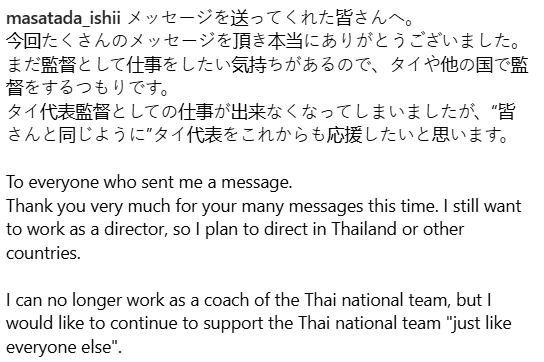 ล่าสุด อดีตเฮดโค้ชทีมชาติไทย โพสต์ผ่านสื่อโซเชียลมีเดีย ข้อความภาษาญี่ปุ่นและอังกฤษ ระบุว่า