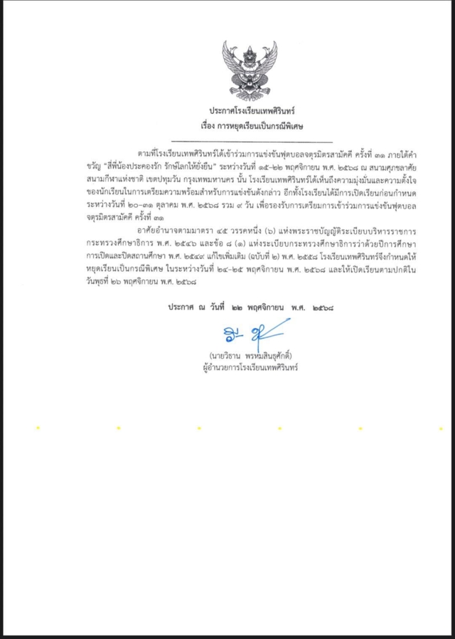 นอกจากนี้ โรงเรียนเทพศิรินทร์ ยังได้ประกาศหยุดการเรียนการสอนเป็นเวลา 2 วัน ระหว่างวันที่ 24-25 พ.ย. 68 หลังนักเรียนเข้าร่วมทำกิจกรรมในครั้งนี้
