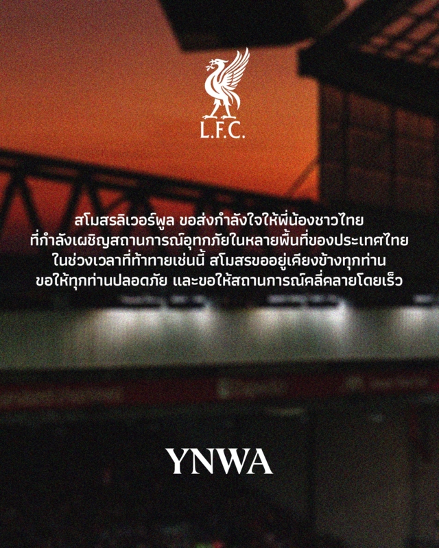" สโมสร ลิเวอร์พูล ขอส่งกำลังใจให้พี่น้องชาวไทย ที่กำลังเผชิญสถานการณ์อุทกภัยในหลายพื้นที่ของประเทศไทย ในช่วงเวลาที่ท้าทายเช่นนี้ สโมสรขออยู่เคียงข้างทุกท่าน ขอให้ทุกท่านปลอดภัย และขอให้สถานการณ์คลี่คลายโดยไว "