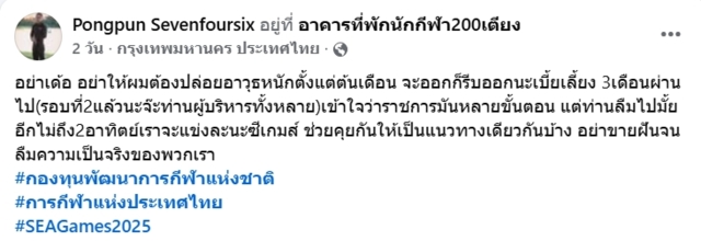"อย่าเด้อ อย่าให้ผมต้องปล่อยอาวุธหนักตั้งแต่ต้นเดือน จะออกก็รีบออกนะเบี้ยเลี้ยง 3 เดือนผ่านไป(รอบที่ 2 แล้วนะจ๊ะท่านผู้บริหารทั้งหลาย) เข้าใจว่าราชการมันหลายขั้นตอน แต่ท่านลืมไปมั้ยอีกไม่ถึง 2 อาทิตย์เราจะแข่งละนะซีเกมส์ ช่วยคุยกันให้เป็นแนวทางเดียวกันบ้าง อย่าขายฝันจนลืมความเป็นจริงของพวกเรา"