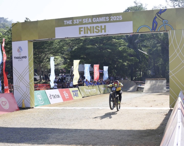 "เบส" เมธาสิทธิ์ บุญเสน่ห์ นักจักรยานเสือภูเขาดาวน์ฮิลทีมชาติไทย ควบสองล้อคู่ใจ กระโดดข้ามเนิน ก่อนเข้าเส้นชัย คว้าเหรียญทองแรกให้ทัพจักรยานไทย ด้วยเวลา 2:37.856 นาที การแข่งขันกีฬาซีเกมส์ ครั้งที่ 33 ที่สวนสัตว์เขาเขียว จ.ชลบุรี เมื่อวันที่ 10 ธ.ค. 68 ที่ผ่านมา