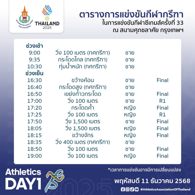การแข่งขันซีเกมส์2025 หรือ ซีเกมส์ ครั้งที่ 33 ที่ประเทศไทยเป็นเจ้าภาพ ระหว่างวันที่ 9-20 ธ.ค. 68 โดยวันนี้ 11 ธ.ค. เตรียมลุ้นทัพกรีฑาไทย ลงทำการแข่งขันหลายรายการ พร้อมทั้งยังเป็นการชิงชนะเลิศ ในวันเดียวจบ แข่งขันที่สนามศุภชลาศัย