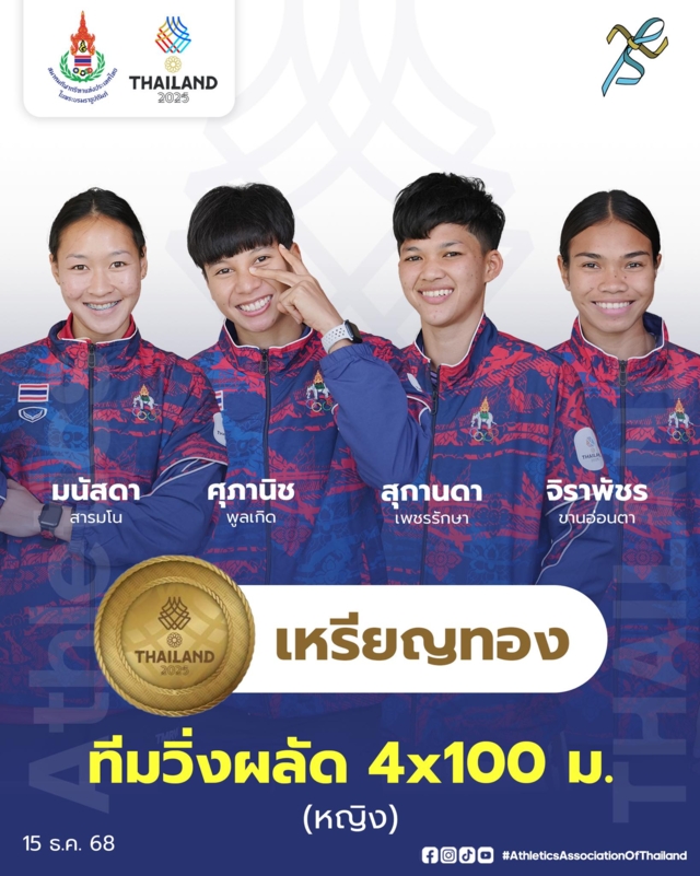 การแข่งขันกรีฑาในมหกรรมกีฬาซีเกมส์ ครั้งที่ 33 ที่สนามศุภชลาศัย ไฮไลต์อยู่ที่การแข่งขันวิ่งผลัด 4x100 เมตรหญิง สำหรับทีมนักกีฬาประกอบด้วย ไม้แรก "มนัสดา สารมโน" ไม้สอง "ศุภานิช พูลเกิด" ไม้สาม "สุกานดา เพชรรักษา" และไม้สุดท้าย "จิราพัชร ขานอ่อนตา"